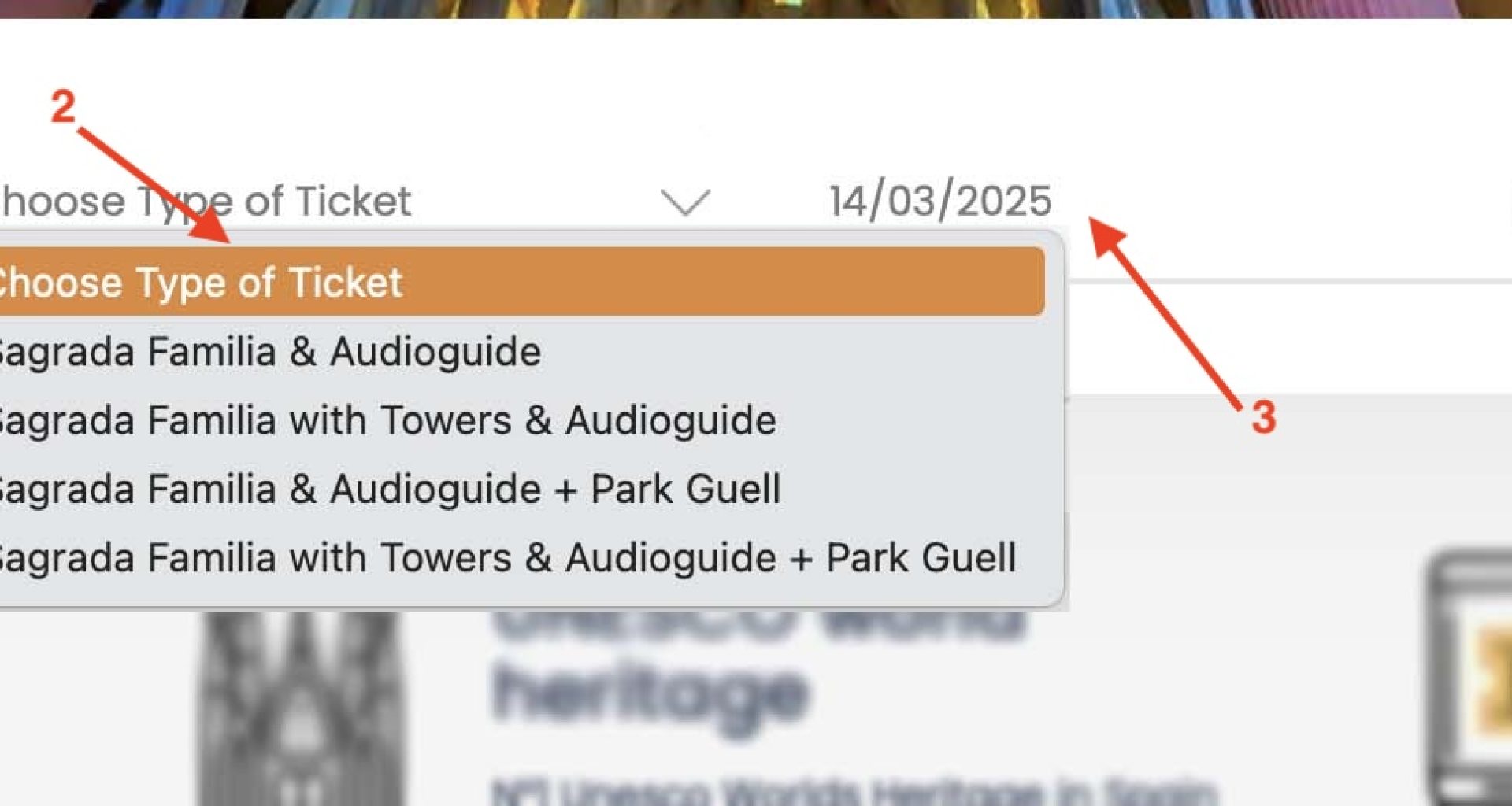 In order to book your Sagrada Familia entry tickets, simply choose Sagrada Familia as type of visit (1), select the type of ticket (2), the date of visit (3) and click on “Check availabilities”.